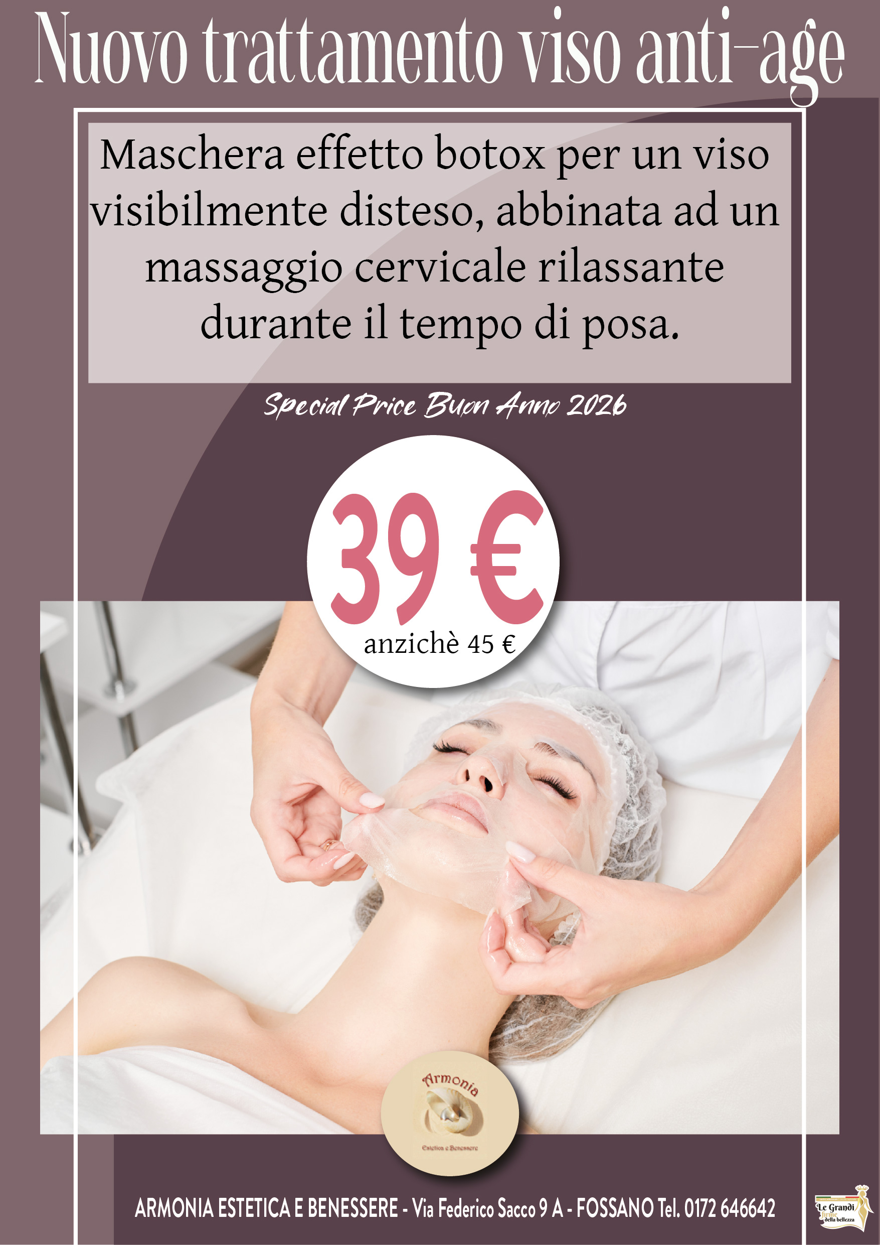 Il nuovo anno porta con sé il desiderio di rinnovamento, leggerezza e cura di sé. Da Armonia Estetica e Benessere iniziamo il 2026 con una novità pensata per chi vuole regalarsi un momento di relax profondo e un viso visibilmente più disteso: il nostro nuovo trattamento viso anti-age con maschera effetto botox: